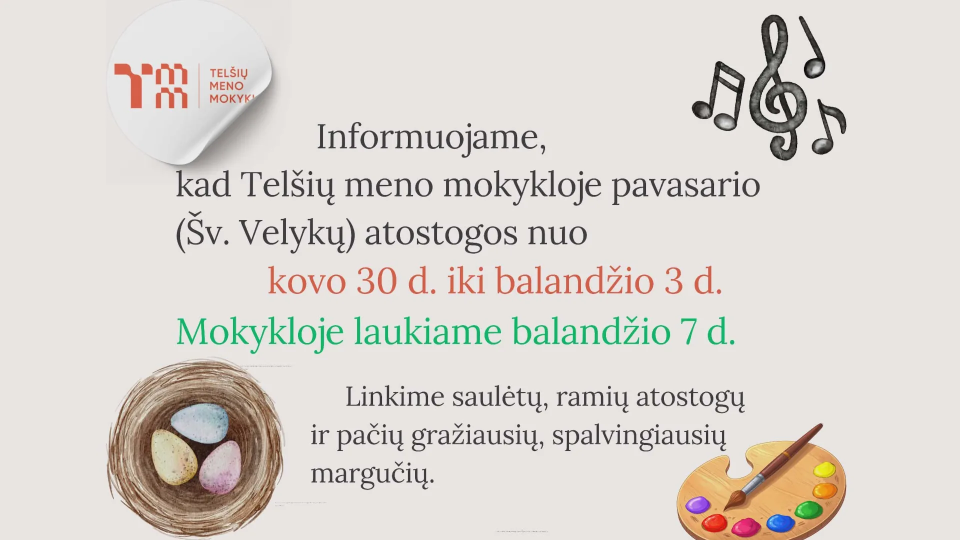 Informuojame, kad Telšių meno mokykloje pavasario (Šv. Velykų) atostogos nuo kovo 30 dienos iki balandžio 3 dienos.