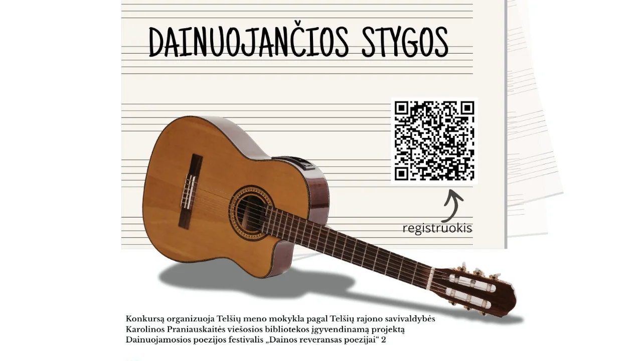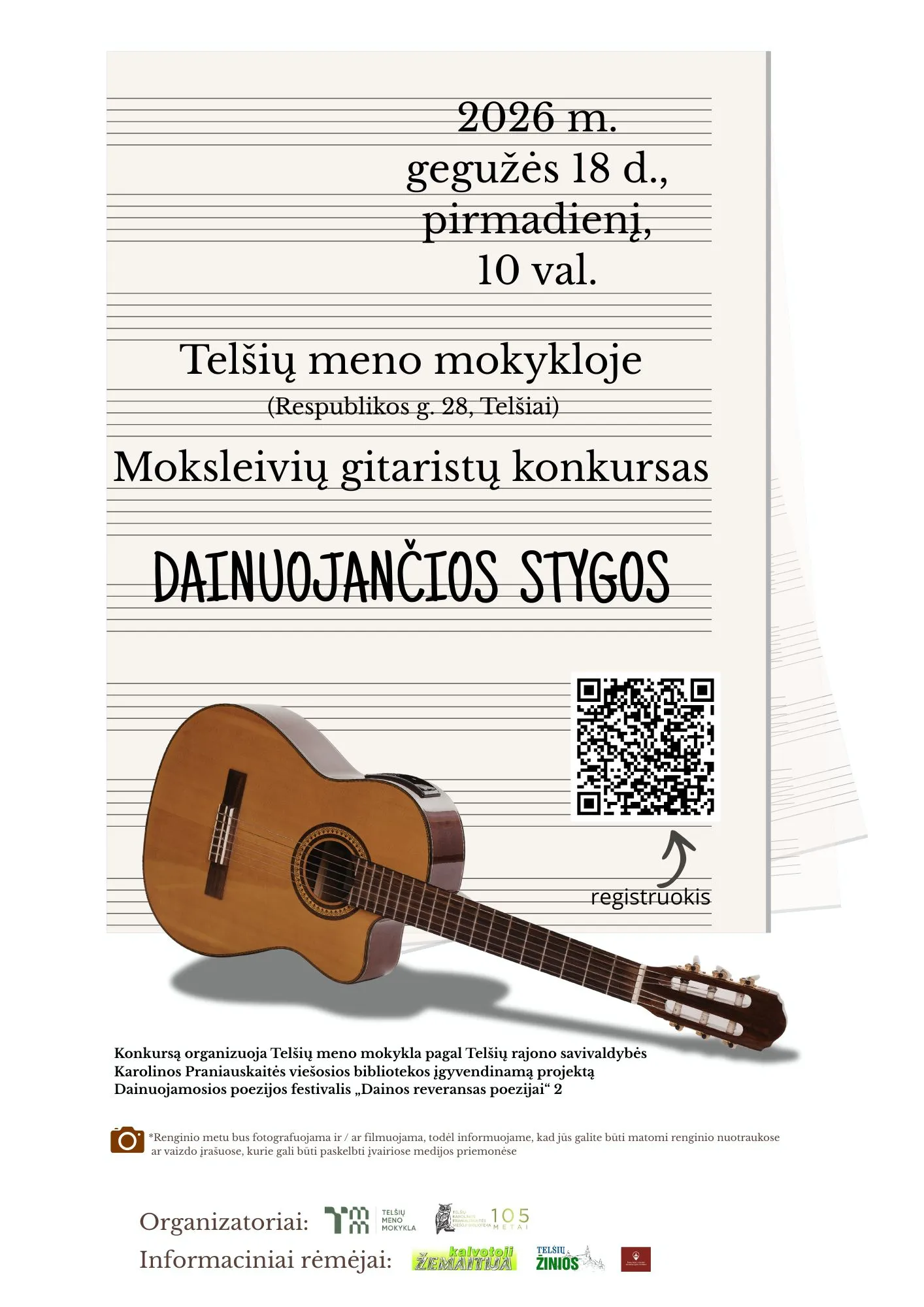 2026 metų gegužės 18 dieną, pirmadienį, 10 valandą, Telšių meno mokykloje vyks gitaristų konkursas „Dainuojančios stygos“.