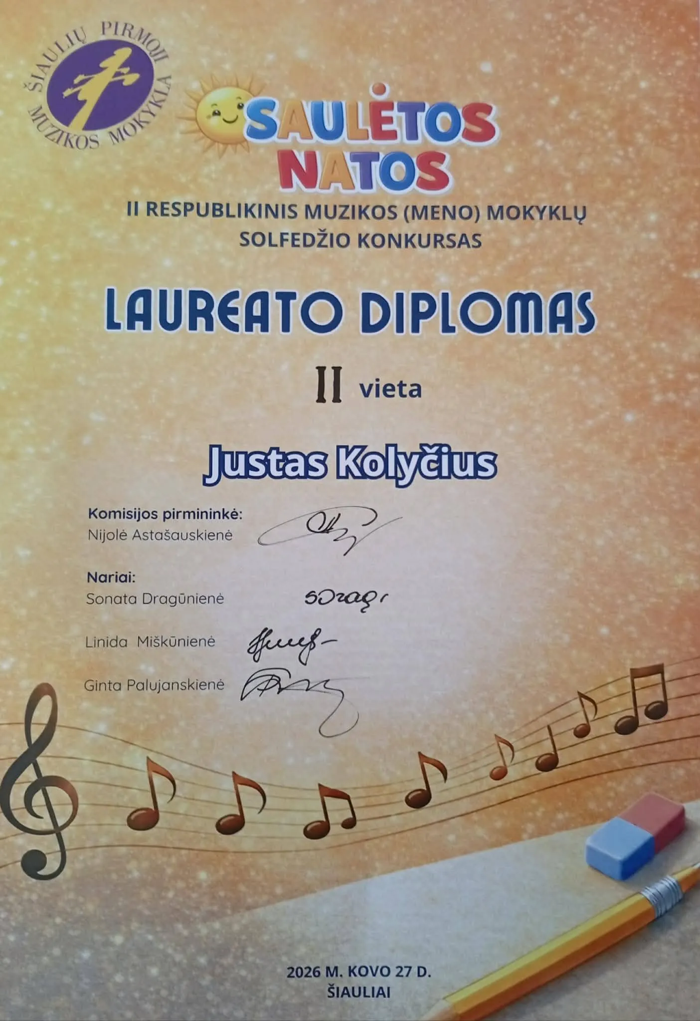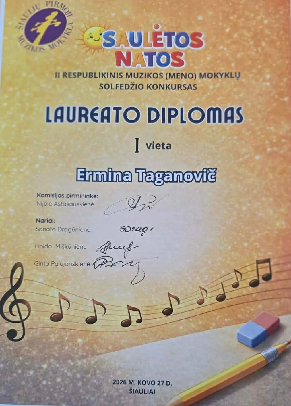 Kovo 27 d. Telšių meno mokyklos mokiniai Ermina Taganovič ir Justas Kolyčius dalyvavo Šiaulių 1-oios muzikos mokyklos surengtame II-ame Respublikiniame muzikos (meno) mokyklų solfedžio konkurse „Saulėtos natos 2026“. Ermina Taganovič pelnė I-ąją, o Justas Kolyčius – II-ąją vietas. Mokytoja Vilija Grigutienė.